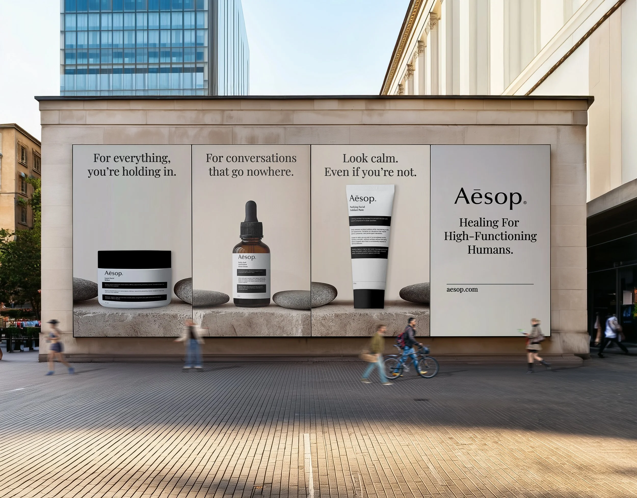 The campaign extends beyond product by introducing Aesop Scream Rooms — soundproof installations placed in high-functioning work environments.Designed as a private moment of release, the space acknowledges that composure often requires interruption.Following this moment, Aesop’s product line supports the transition back to a controlled, composed state.