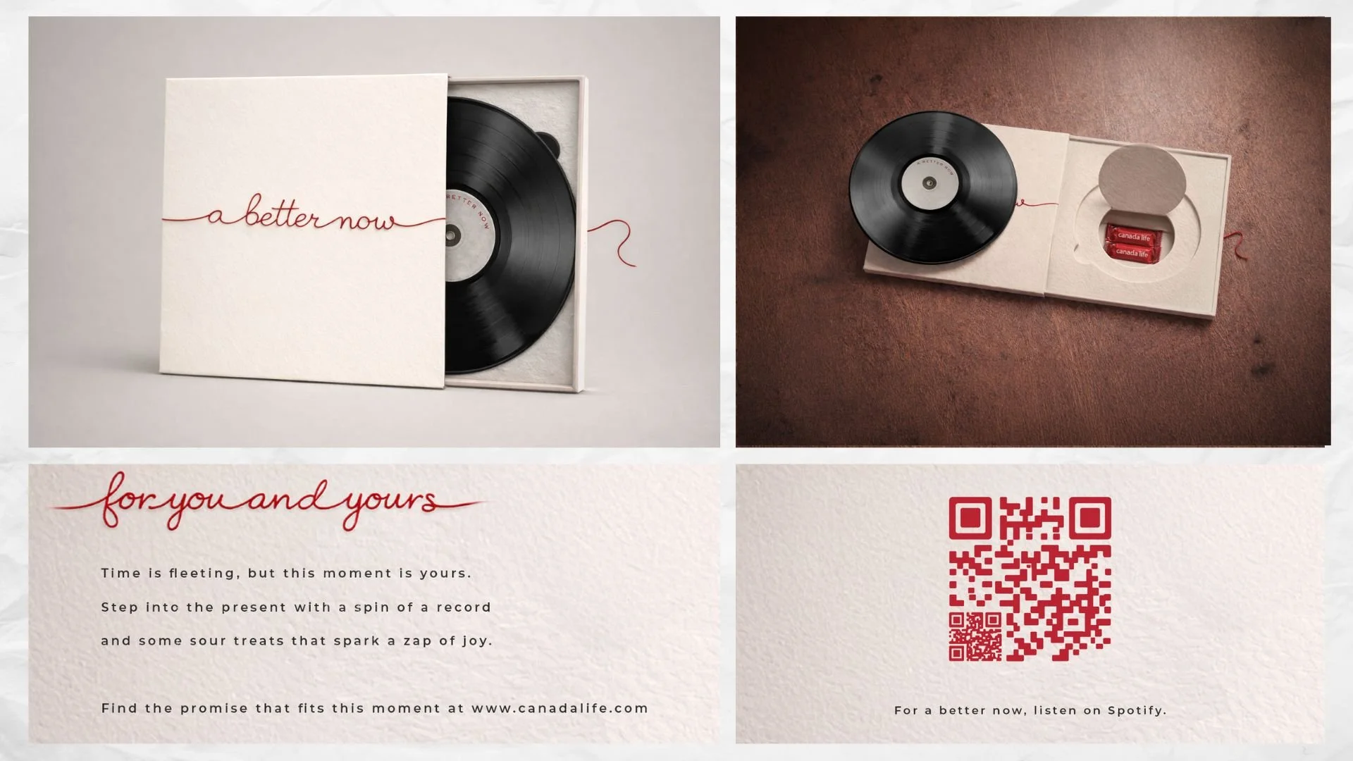 A direct mail vinyl package tucked inside with hidden candies, unleashing a sour shock of joy over some warm melodies. Connect the physical and digital worlds via vinyl record and QR code, launching a curated playlist to help Gen Z pause and feel a better now.